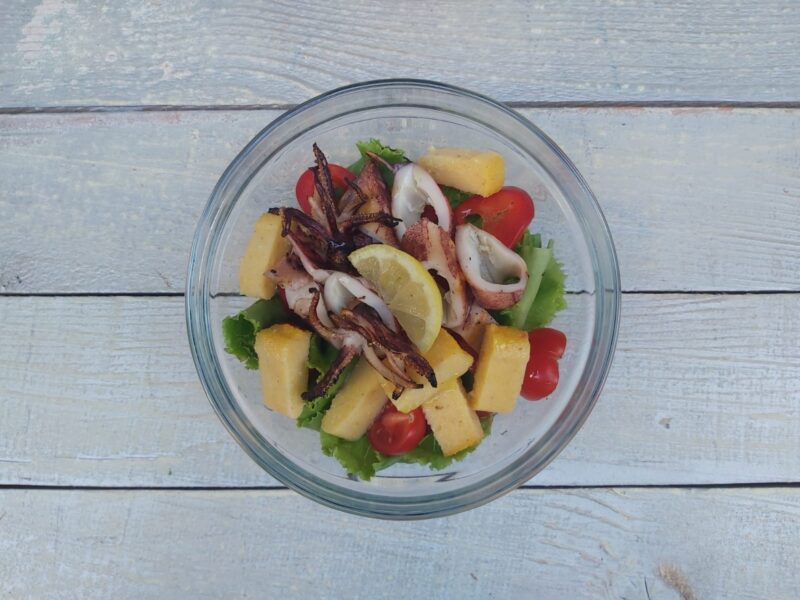Salata sa lignjama na žaru, palentom i svježim povrćem